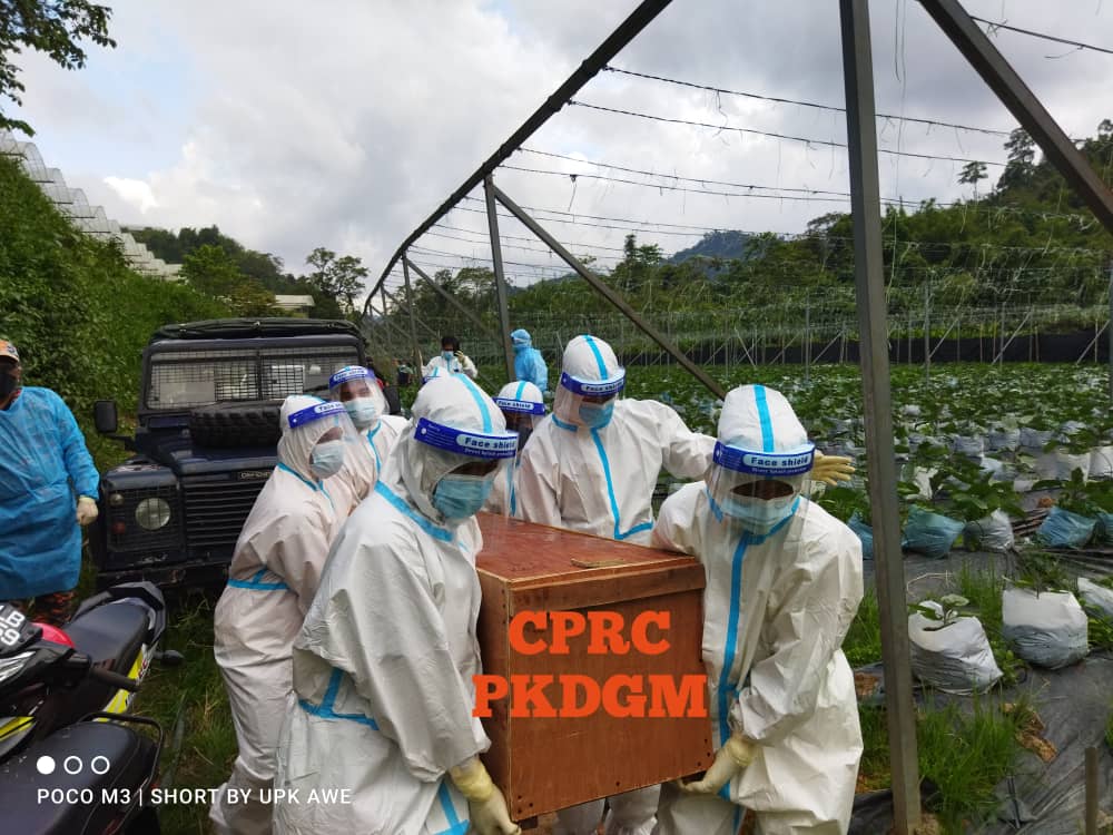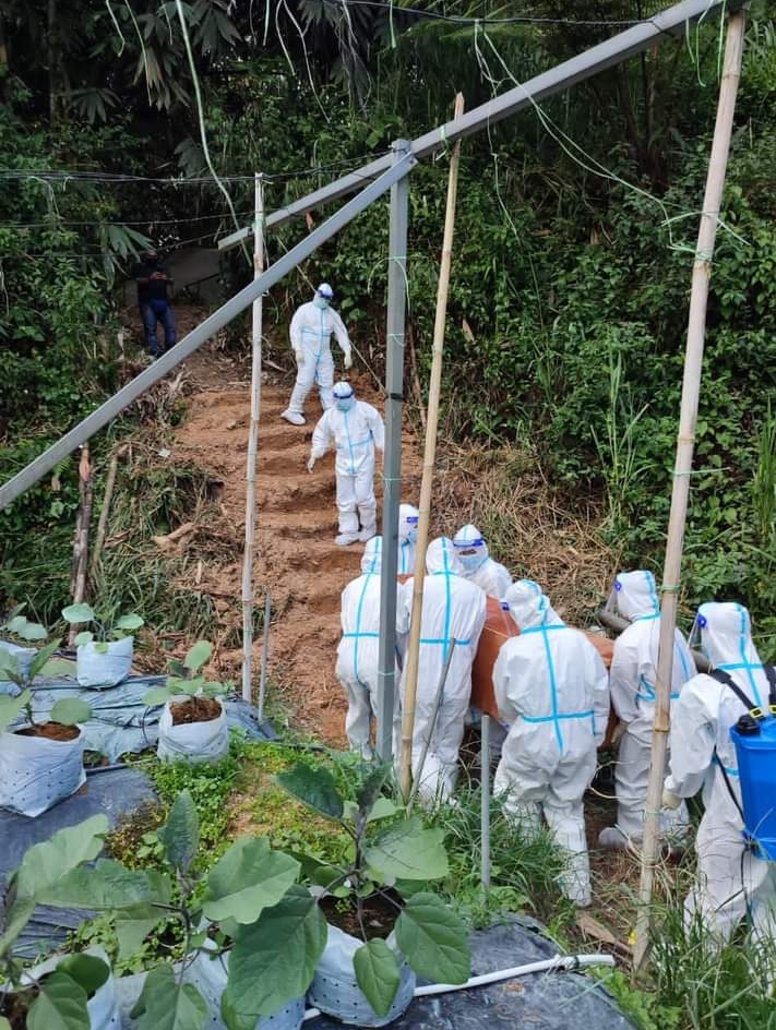 Diketuai PKPgB Mohd Arifuddin akif bersama 06 anggota bertugas dari Balai Bomba Dan Penyelamat Gua Musang hadir ke Tanah Perkuburan Orang Asli Kampung Sengsang Gua Musang untuk pengurusan Jenazah orang Asli yang dijangkiti Covid-19. Anggota menggunakan 2 unit pam dengan campuran air,dettol dibancuh mengikut sukatan. Anggota memakai pakaian lengkap PPE dan membuat semburan keseluruhan kenderaan dan anggota yang terlibat bagi mencegah penyakit berjangkit Covid-19 sehingga selesai sepenuhnya.