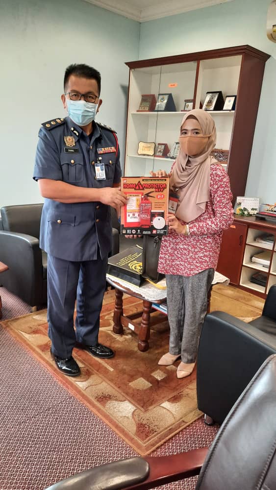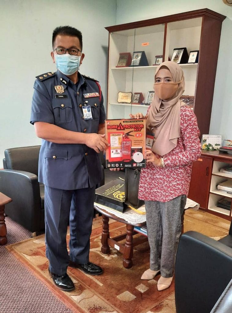 YS PPjB Jainal @ Zainal bin Madasin, Pengarah Jabatan Bomba dan Penyelamat Malaysia Negeri Kelantan,menyampaikan bahan kempen keselamatan kebakaran kepada Puan Rosalwani bin Che Soh, dari Utusan Malayu(Malaysia) Berhad di Ibu Pejabat JBPM Negeri Kelantan pada Ahad( 25 April 2021) selepas sesi ditemuramah berkaitan perkembangan Jabatan Bomba dan Penyelamat Malaysia Negeri Kelantan.