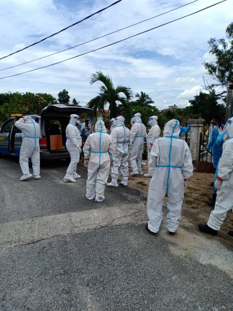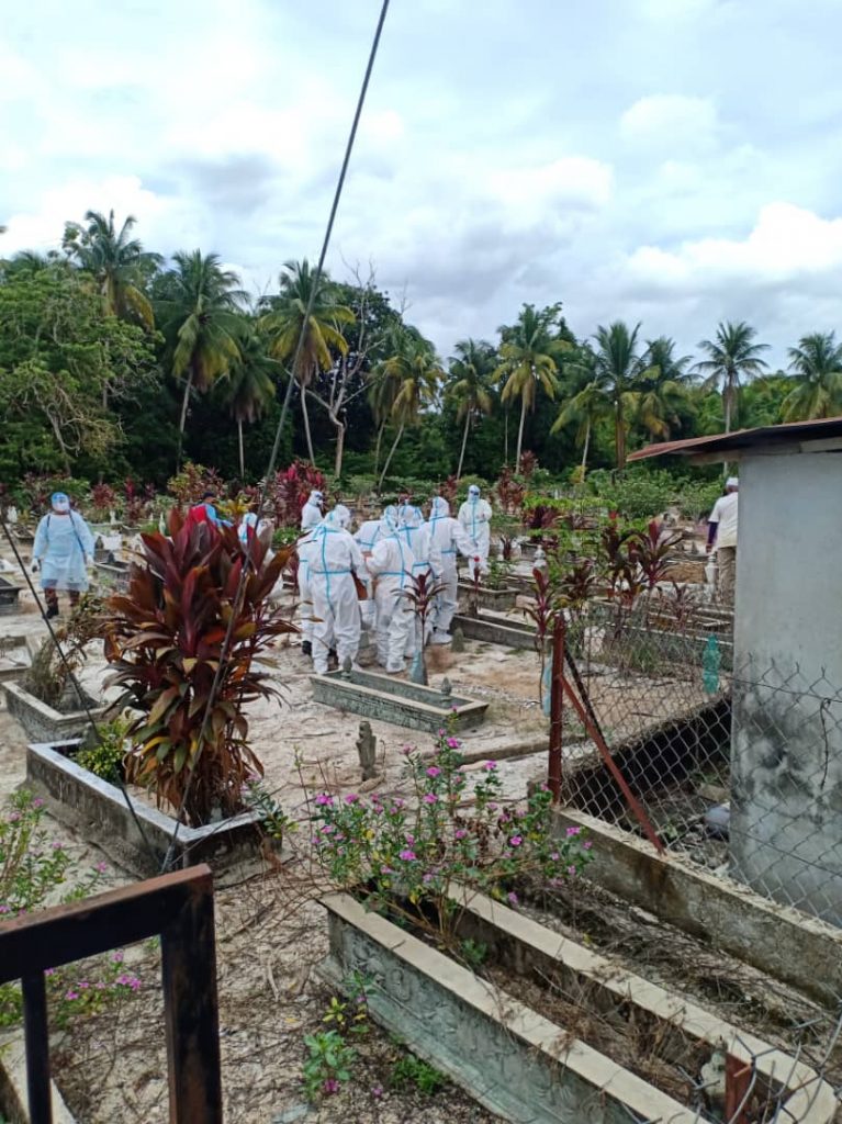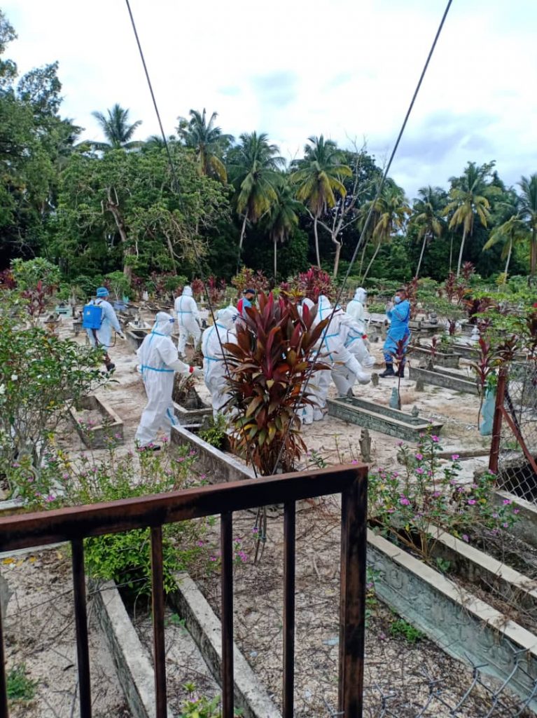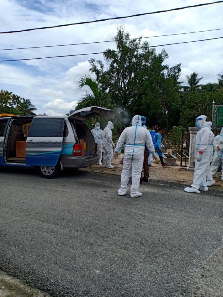 Di ketuai PPgB Azhar Elmi bin Mustofar dari Balai Bomba dan Penyelamat Pasir Puteh bersama 7 anggota bertugas hadir ke Tanah Perkuburan Islam Kg Padang Siam ,Pasir Puteh untuk pengurusan pengebumian jenazah lelaki warga emas 67 tahun Covid-19. Anggota menggunakan 1 unit pam dengan campuran air, dettol dibancuh mengikut sukatan. Anggota memakai pakaian lengkap PPE dan membuat semburan keseluruhan kenderaan dan anggota yang terlibat bagi mencegah penyakit berjangkit Covid-19 sehingga selesai sepenuhnya.