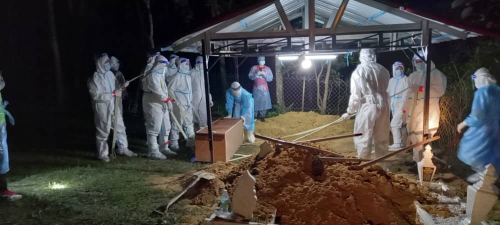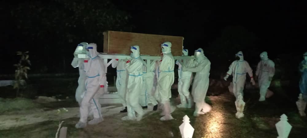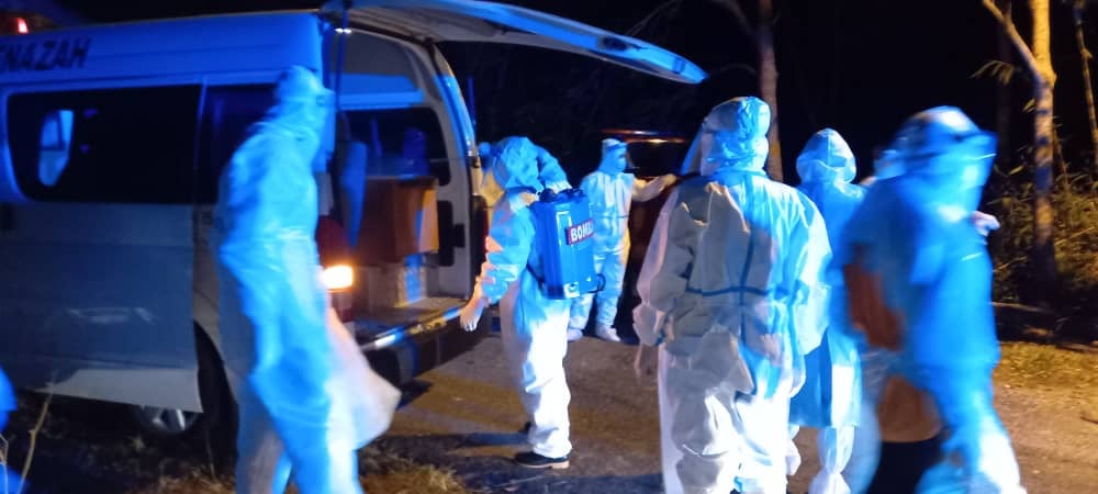 Diketuai PPgB Azhar Elmi bin Mustofar bersama 09 anggota bertugas dari Balai Bomba Dan Penyelamat Pasir Puteh hadir ke Tanah Perkuburan Islam Kampung Telosan Pasir Puteh untuk pengurusan Jenazah Covid-19. Anggota menggunakan 1 unit pam dengan campuran air,dettol dibancuh mengikut sukatan. Anggota memakai pakaian lengkap PPE dan membuat semburan keseluruhan kenderaan dan anggota yang terlibat bagi mencegah penyakit berjangkit Covid-19 sehingga selesai sepenuhnya.