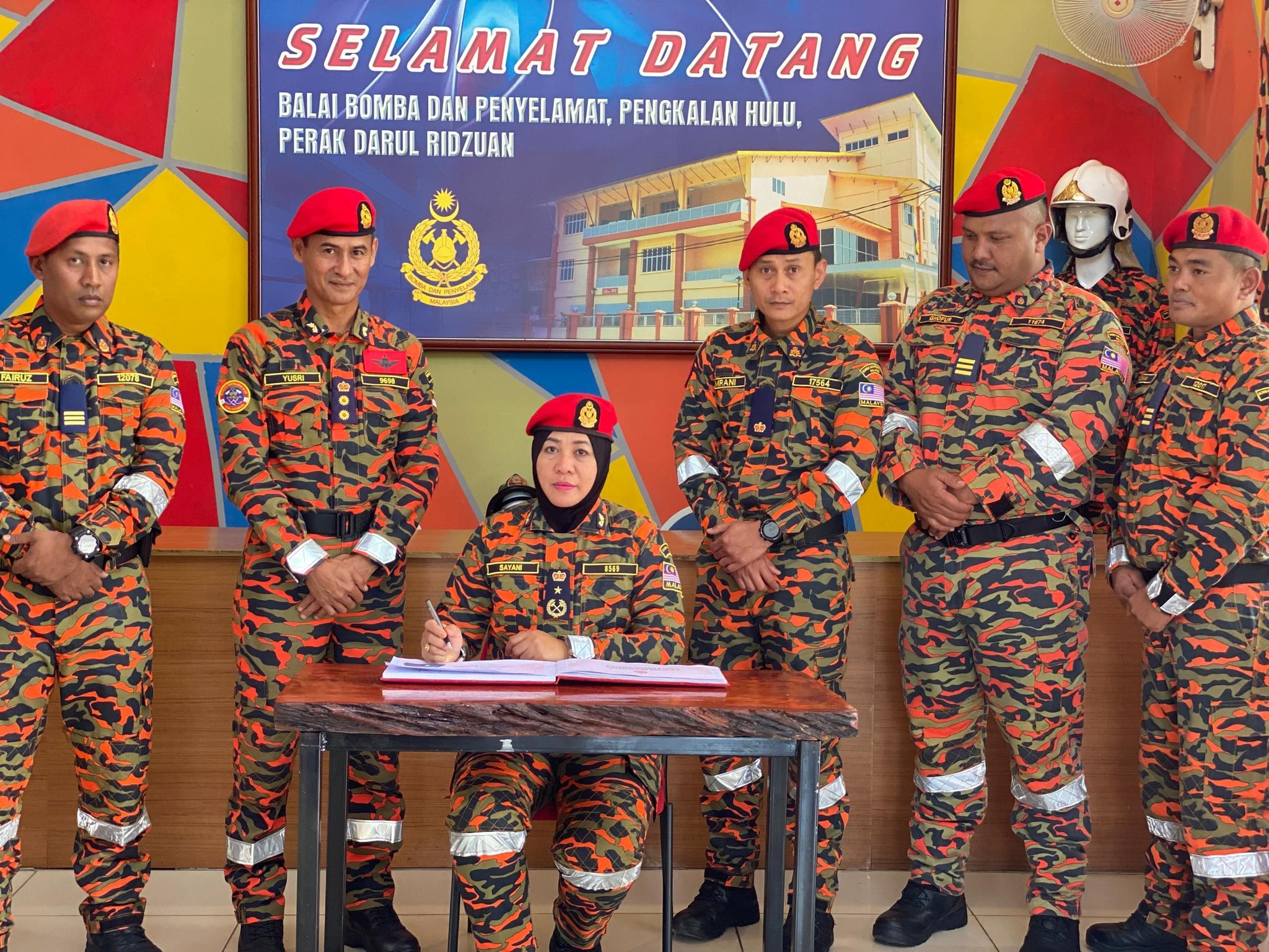 Dalam lawatan ini, Yang Setia PKPjB Sayani binti Haji Saidon, Pengarah JBPM Negeri Perak, bersama PPjB Yusri bin Mohd Yusoff, Timbalan Pengarah JBPM Negeri Perak, telah melaksanakan pemeriksaan peralatan pelindung diri (PPE) melalui Kits Inspection serta meninjau fasiliti balai bagi memastikan tahap kesiapsiagaan yang optimum.
