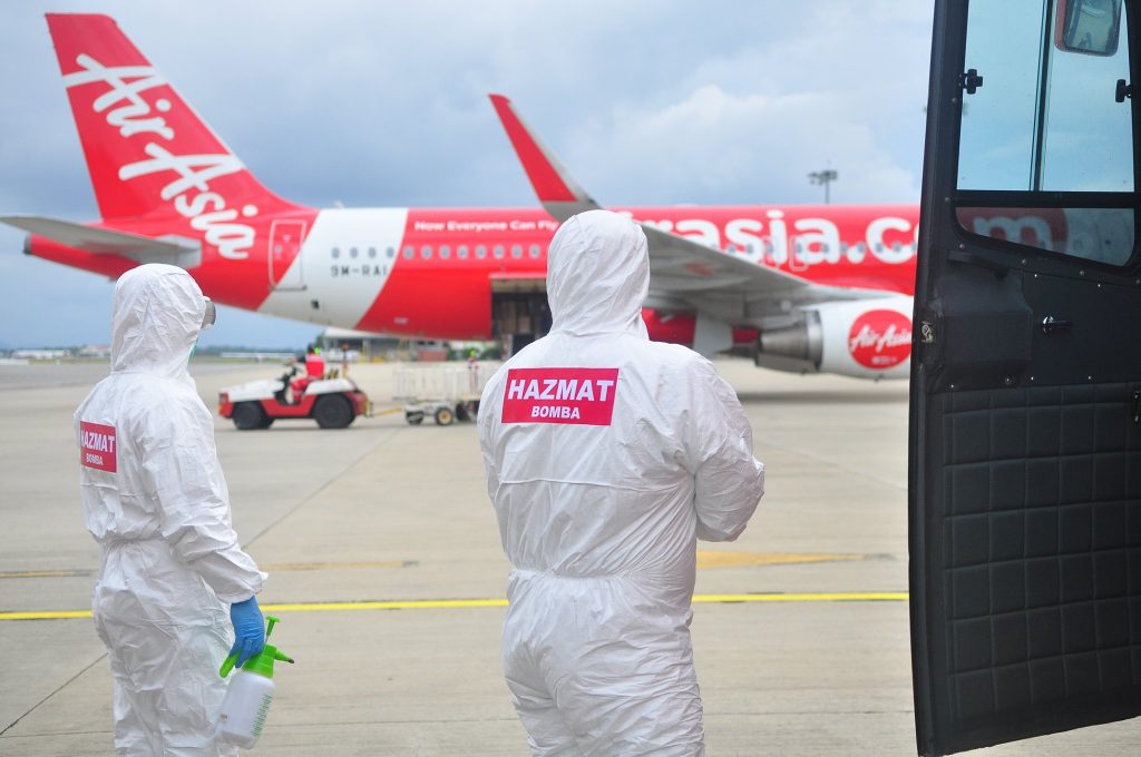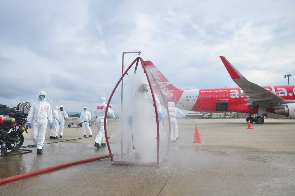 Pasukan HAZMAT Khas JPBM Sabah bersiap sedia melaksanakan proses Nyah Cemar di Lapangan Terbang Antarabangsa KKIA Terminal 2.