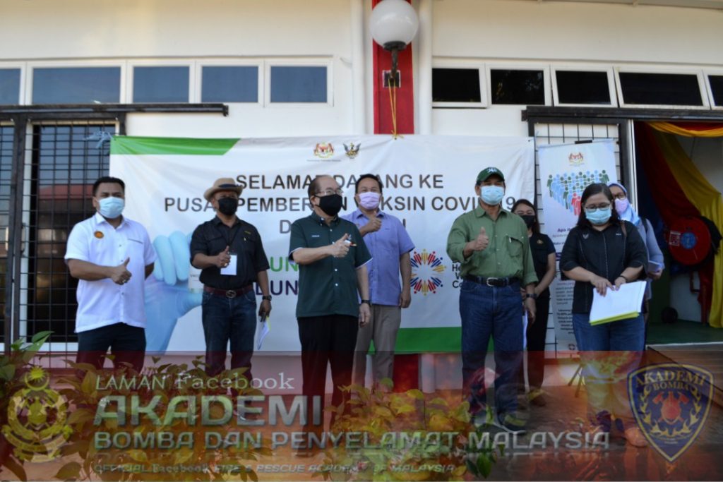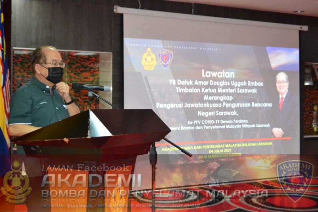 Lawatan Datuk Amar Douglas Uggah Embas, Timbalan Ketua Menteri Sarawak merangkap Pengerusi Jawatankuasa Pengurusan Bencana Negeri Sarawak ke Pusat Pemberian Vaksin Daerah Bau di Dewan Perdana ABPM Wilayah Sarawak dan Sesi Taklimat di Dewan Taiton ABPM Wilayah Sarawak pada 4 Julai 2021 (Ahad)