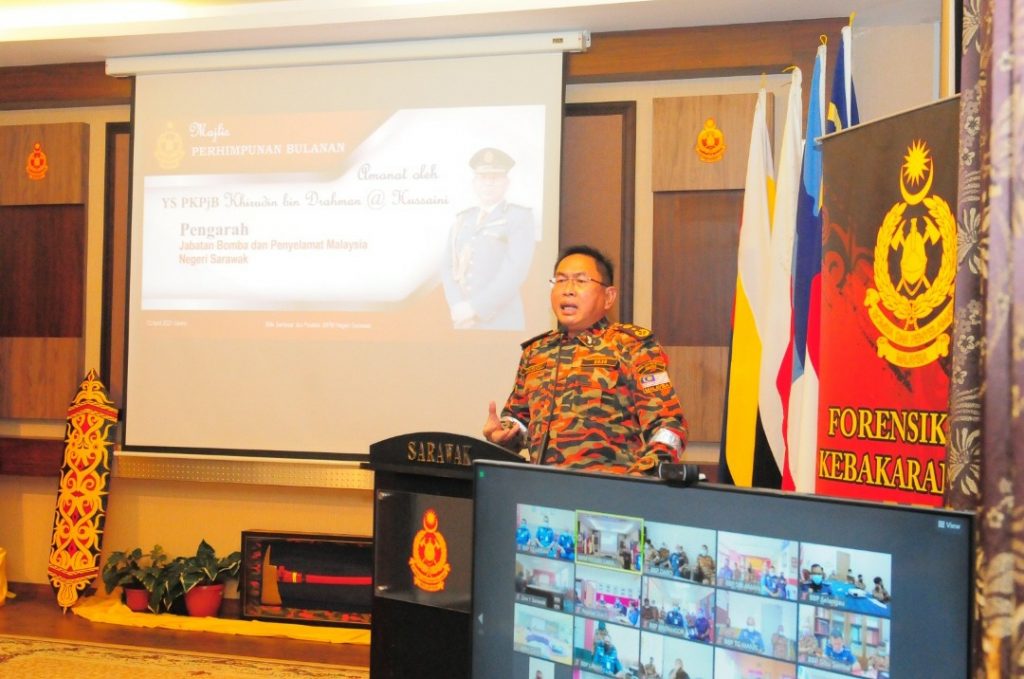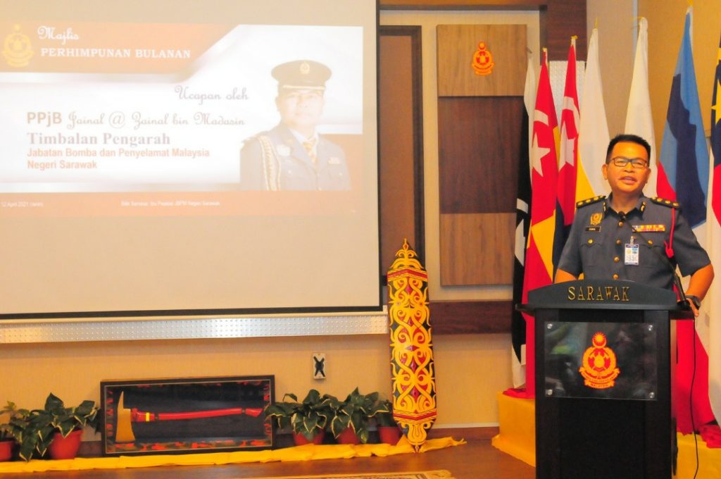 YS PKPjB Khirudin bin Drahman @ Hussaini, Pengarah JBPM Sarawak menghadiri Perhimpunan Bulanan April 2021 yang diadakan di Bilik Seminar Ibu Pejabat JBPM Sarawak pada pagi tadi.Selain daripada itu, Majlis Ringkas Perpisahan PPjB Jainal @ Zainal bin Madasin, Timbalan Pengarah JBPM Sarawak yang akn berpindah ke JBPM Kelantan.Perhimpunan ini juga diikuti secara maya oleh seluruh Pejabat Zon dan Balai Bomba dan Penyelamat di seluruh Sarawak.