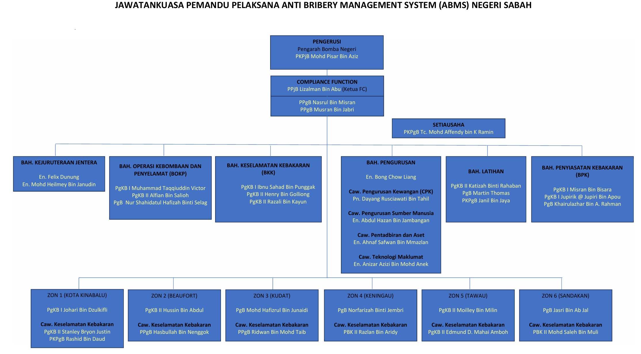 Carta Organisasi Pemandu ABMS JBPM Negeri Sabah Introduction to ABMS | Committee Organization Chart | Integrity Policy & Anti-Corruption Policy | Mileage Chart | Posters | Frequently Asked Questions | Report Misconduct | Video Pesanan Integriti